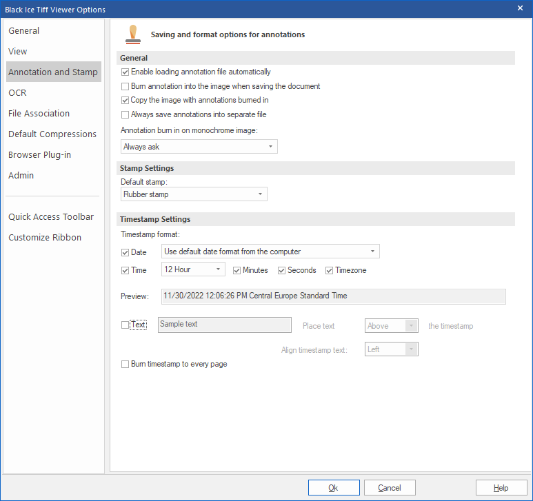 On the Annotation and Stamp tab, one can configure the stamp, the annotation settings, timestamp settings, and select the default stamp.