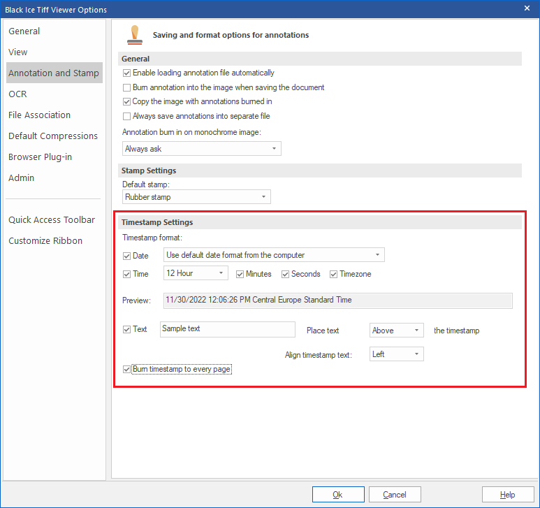 Burn timestamp to every page: If checked, TIFF Viewer burns the timestamp annotations to every page of the document. If unchecked, TIFF Viewer burns the timestamp annotations to the page where they were placed.