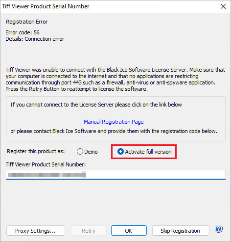The Tiff Viewer also can be registered through a proxy server. For more information please refer to the Registering through a Proxy server section.