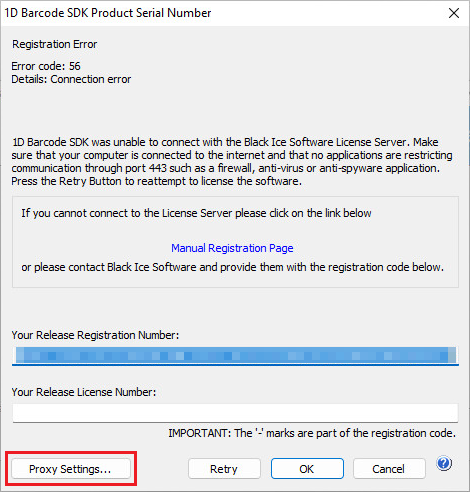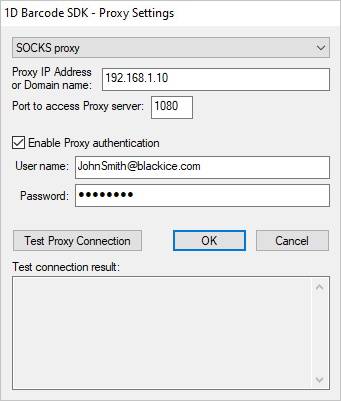 4. SOCKS Proxy - Select SOCKS proxy from the drop-down list to configure the Proxy IP address and port number manually. SOCKS proxy servers establish a TCP connection to licenseserver.blackice.com and forward TCP messages from the Black Ice Barcode SDK/ActiveX during registration and license validation.