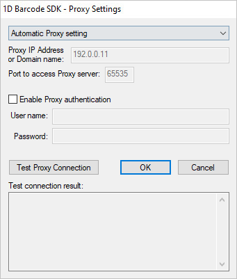 If the Proxy server is using user authentication, the Proxy authentication checkbox must be checked and the User name and Password must be specified.