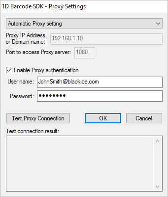 After entering the IP Address/Domain Name, Port, and possible Authentication Credentials to access the Proxy Server desired to use, click the Test Proxy Connection button to test the connection through the Proxy Server towards the Black Ice License Server.