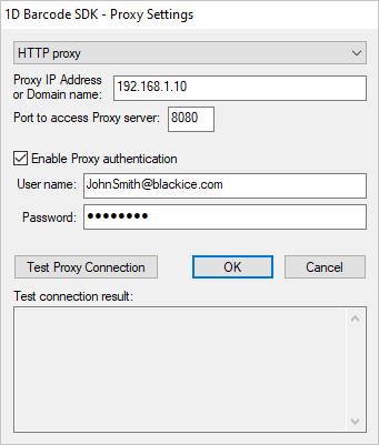 3. HTTP Proxy - Select HTTP proxy from the drop down list to configure the HTTP Proxy IP Address and port number manually. The HTTP proxy server receives HTTP requests from the Black Ice Barcode SDK/ActiveX during registration and license validation and then forwards the requests to licenseserver.blackice.com.