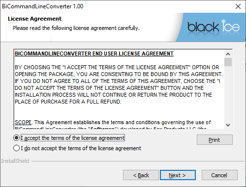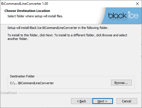 Choose the location where you want BiCommandLineConverter (BiCommandLineConverter Demo) to be installed – the default (and recommended) location is C:\Program Files\Black Ice Software LLC\BiCommandLineConverter- and click Next.