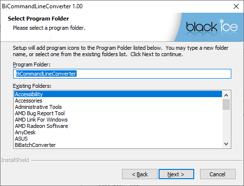 The following window allows you to specify the name of the Program Folder that BiCommandLineConverter will be listed under. Type in a new folder name if desired.