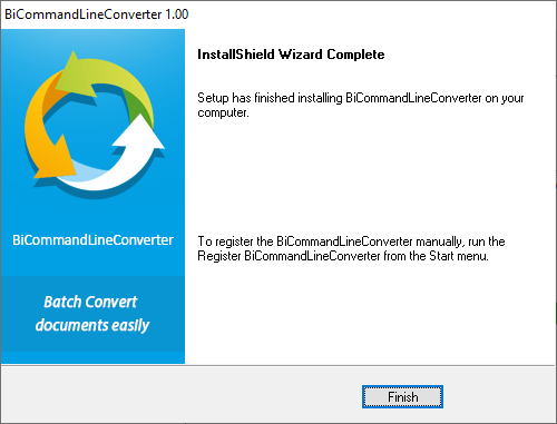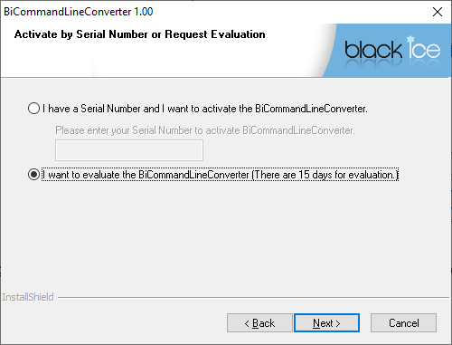 To install the evaluation version of BiCommandLineConverter, please select the I want to evaluate the BiCommandLineConverter option. Users have 15 days for evaluating the BiCommandLineConverter demo. To install the full version of the BiCommandLineConverter, please refer to the Installing the BiCommandLineConverter Release versionsection of the manual.