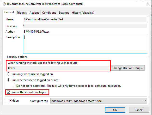 To run the BiCommandLineConverter task with an administrator account, please follow these steps: