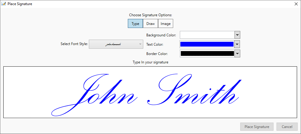 In type in mode, one can select the style in which the name will be written out, and type it in the signature field with keyboard.