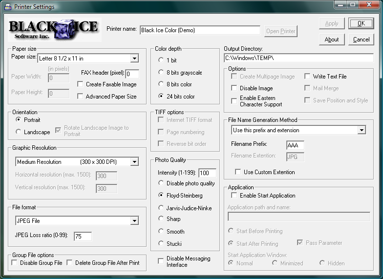 The ‘PrinterSettings’ program allows users to change the settings of the Black Ice printers.
