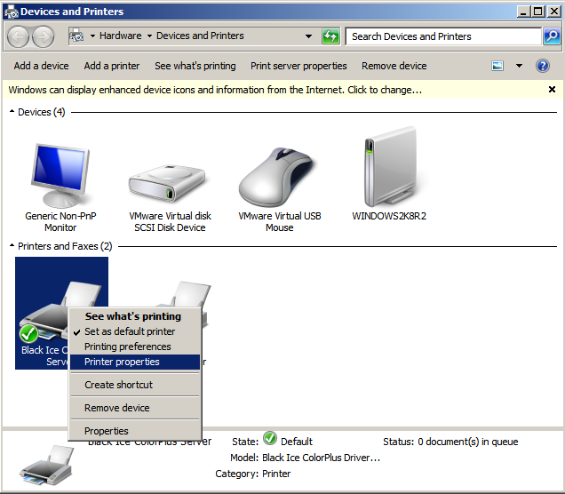 1. To Share a Black Ice Printer Driver, go to Control Panel > Printers and Devices and right click on the printer you would like to share, and click on Printer properties.