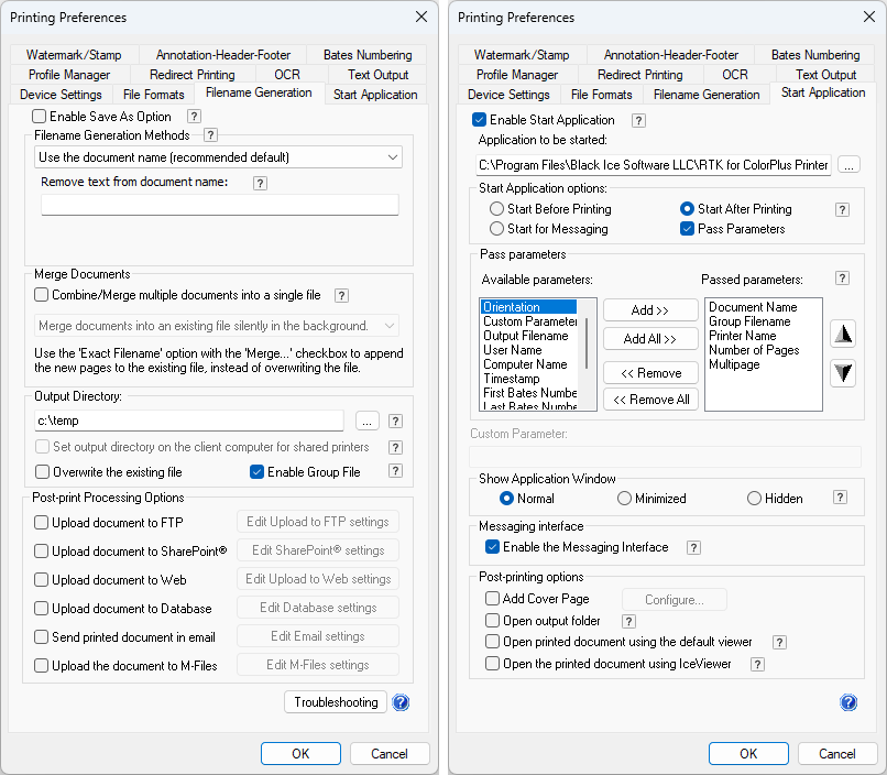 On the Start Application tab, check Enable Start Application and choose Output Filename VB.NET Sample.exe from the Samples folder. Select Start After Printing and check Pass Parameters. Pass the parameters in the following order: