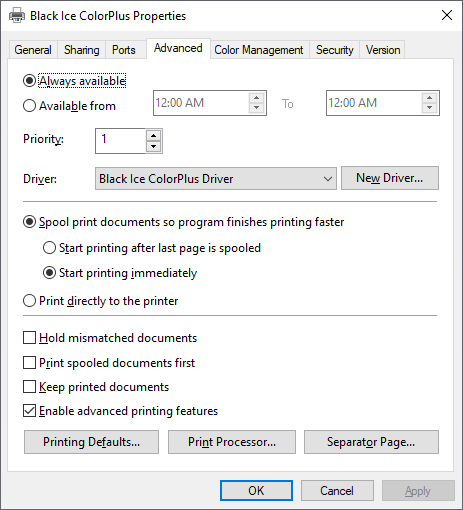 Select the Advanced tab, then click on the “Printing Defaults…” button.