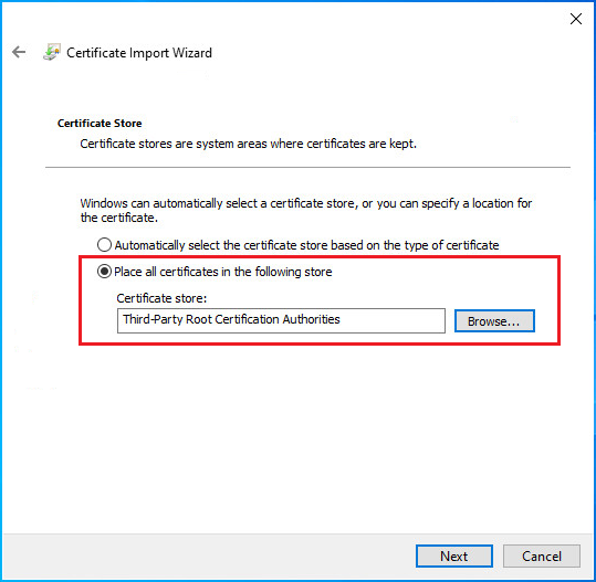 In the Import Wizard, select “Place all certificates in the following store”, click Browse, and select “Third-Party Root Certification Authorities“.