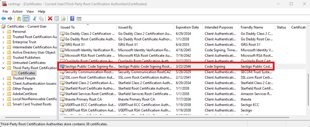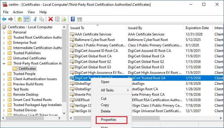 In the certmgr window, go to “Third-Party Root Certification Authorities\Certificates” and check that you can find the downloaded certificate: