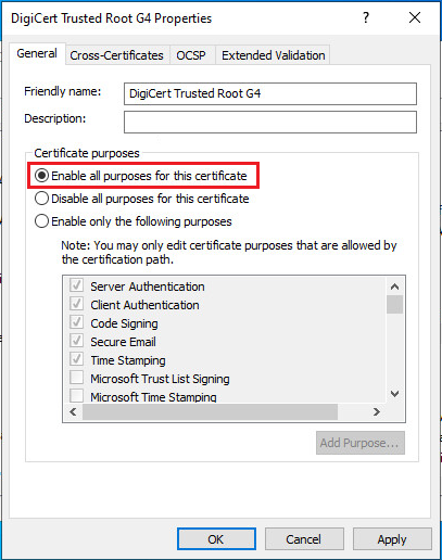 Check that the certificate is enabled and click OK.