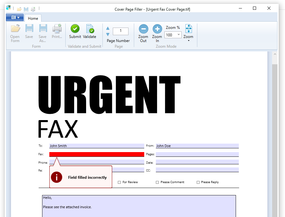 The main purpose of Cover Page Filler is to create and to fill out cover pages. Once a cover page is filled out, users have the option to validate it. Validation can be initiated by clicking on the Validate button. When validation fails, a popup message appears under the first wrongly filled field indicating that the field was filled incorrectly. If every required field is filled, click on the Submit button to create the cover page. If pressing the Submit button before validation, Cover Page Filler validates the fields before creating the cover page.