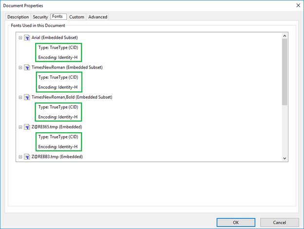 If the option is unchecked The Printer Driver embeds fonts with ANSI encoding, and if the document contains Unicode characters or glyph indexes, the Printer Driver will also embed “Identity” encoded CID fonts. (default)