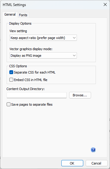 Save pages to separate files: When this option is checked a separate HTML will be generated for each page of the source document, otherwise only one full html page will be created which will include all the pages of the original document..