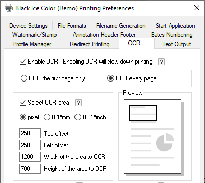 OCR every page – If this option is selected, the Printer Driver will OCR every page of the printed document. If the Select OCR area option is also enabled, the Printer Driver will OCR the specified area on every page of the printed document.