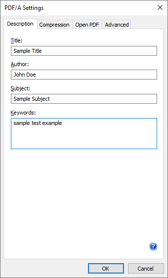 The “PDF settings…” button on the File Formats tab will display a dialog that allows you to specify a number of settings for the printed PDF/A document. The “PDF settings…” button is only enabled if the selected file format is PDF or PDF/A.