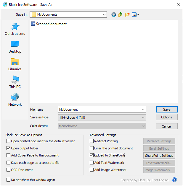 When the Enable Save As Option is selected in the Printing Preferences or Black Ice Printer Manager, the Save As Dialog will be displayed each time before printing the file. The Save As Dialog is very similar to the regular Windows Save As Dialog, except it contains additional Black Ice options: