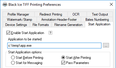 The user must specify the full path of the application to be started by the printer driver. For example, if one wants to start the app.exe application located in the c:\temp folder, use c:\temp\app.exe in the input field. The printer driver can handle long file and directory names. The user must have Read, Execute and Write privileges for the configured directory.