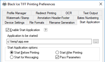 Select this option to start the specified application before the printer driver starts printing. This must be used if an application needs to change the printer driver settings through the messaging interface, or the application needs a long start-up time.