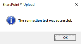 To make sure the SharePoint upload has been configured successfully, please click on the Test Connection button. If the connection is established successfully, the following window appears.