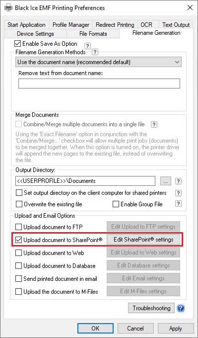 To configure the Printer Driver to upload the printed documents directly to SharePoint, please navigate to the Filename Generation tab on the Printing Preferences window, and enable the Upload document to SharePoint option.
