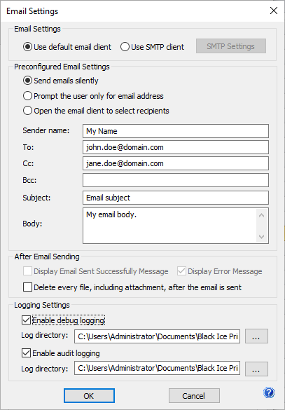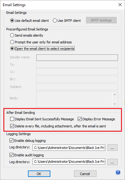 For configuring silent email sending, please refer to the Preconfigured Email Settings section.