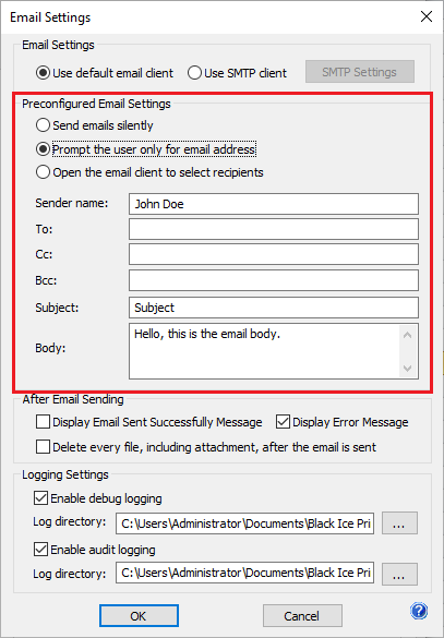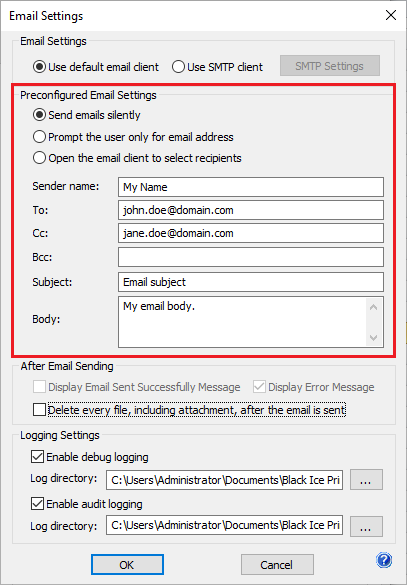 If the Send emails silently option is enabled, users can preconfigure the email preferences including the Sender name, To, Cc, Bcc, Subject and Body, which results silent email sending without any user interaction. If the user prints to the Black Ice Printer Driver will send the email in the background.