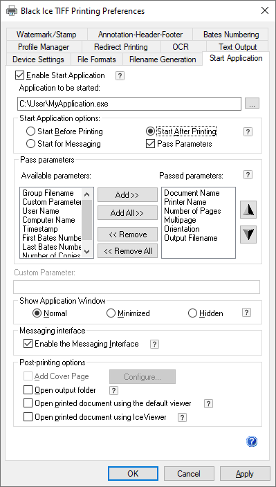By default the printer driver messaging interface is disabled. To activate the printer driver Messaging Interface, navigate to the “Start Application” Tab of the printer driver and check the “Enable Messaging Interface” and enable/select the “Start for Messaging” option. The Messaging Interface can be configured through the Configuring the Drivers for Users by System Administrators section of the manual. The Start Application and the Messaging Interface can be configured through the .INI file during installation.