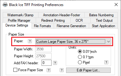 Create a new paper size (for example: 36.00 x 275.00 inches) and click on the OK button: