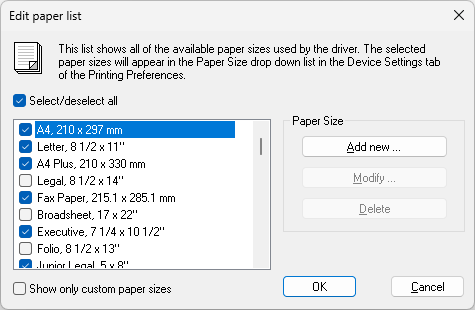 If the Show only custom paper sizes option is enabled, only custom paper sizes are displayed in the list, while standard paper sizes are hidden.