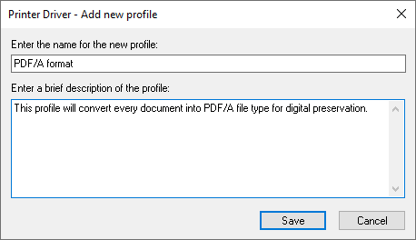 The following window appears where the user can enter a name for the profile and a description. When finished click on Save button: