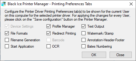 The following window appears where one can configure Printer Manager tabs. The unchecked tabs will not be available in the Printer Manager for users on the computer.