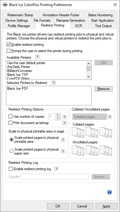 Enable redirect printing log - Enables or disables the log file generation specifically for redirect printing. Log filename and location can be specified. The redirect printing log file contains the following information: