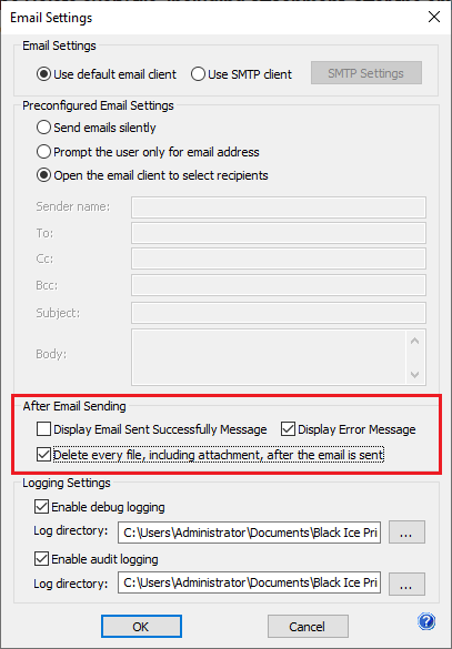 For configuring silent email sending, please refer to the Preconfigured Email Settings section.
