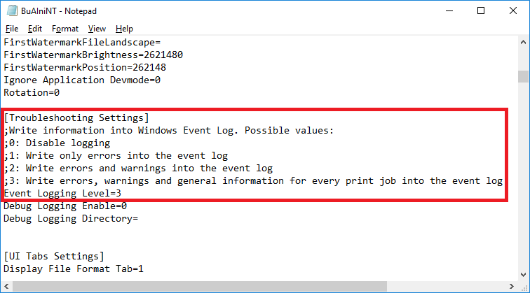 One must modify the Printer Driver INI files to change the Event Log level. Please make sure one has Administrator rights.