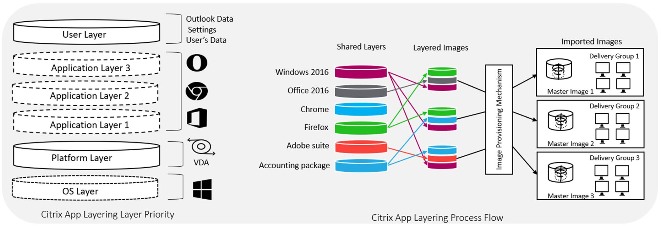 The diagram below illustrates the Citrix App Layering. The Citrix App Layering actually puts applications on a plane separate from the OS and splits the application into three main layers. Each layer is stored as a virtual disk. The base layer contains the OS itself.
