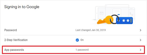 In Google Account, please navigate to the Security tab, and under the “Signing in to Google” section, click on App passwords.