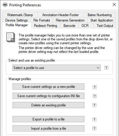 Black Ice Profile files can be created with Black Ice Printer Drivers on the system. To create a profile, go to Control Panel > Devices and Printers > right click on a product, to generate profiles with (Black Ice Printer Driver) > Printing Preferences > set up the desired configuration that.