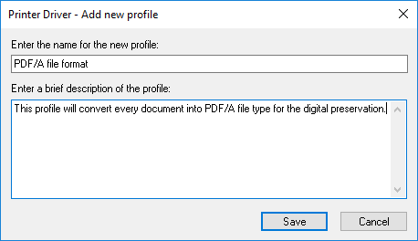The following window appears where the user can enter a name for the profile and a description. When finished click on Save button: