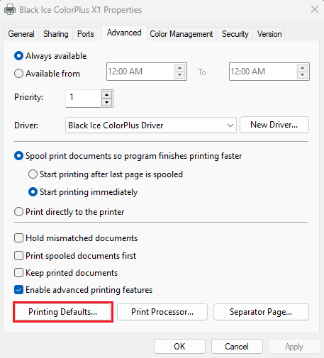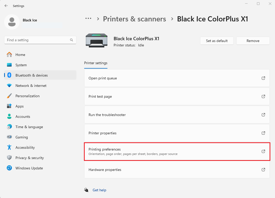 - On Windows 11 Desktop systems: Click on the Black Ice Printer Driver > Click “Printing preferences”.