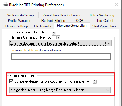 Alternatively, go to the Filename Generation tab, check the Combine/Merge multiple document into a single file option and select the Merge documents using Merge Documents window option.