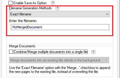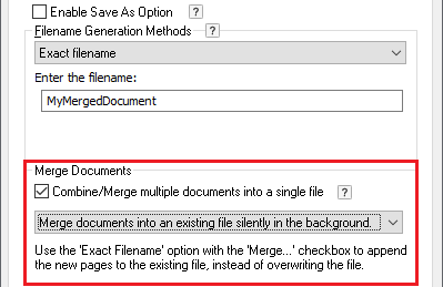 Check the Combine/Merge multiple documents into a single file option and select the Merge documents into an existing file silently in the background option from the drop-down menu.