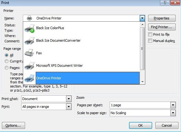 One can configure Agent Printers to print documents into a OneDrive folder on the user’s computer. This folder can automatically upload the printed document to OneDrive Cloud (Cloud storage is a model of networked enterprise storage, where data is stored not in the user's computer, but in virtualized pools of storage, which are generally hosted by third parties). The user can access the file from anywhere with Internet connection. Black Ice non-OEM document converter printer drivers are installed with a Printer Manager utility. The Printer manager can create Agent Printers from the installed Printer Driver. For more information on agent printers, please see the Agent Printers section of the manual.