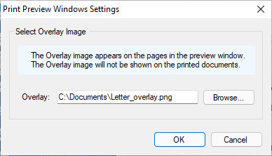 To add an overlay to the printed document, one has to specify an overlay image in a transparent .png format. The overlay image will only appear in the preview window and will not be printed to the output document. Please click on the Preview Overlay Settings button to locate the desired image, and click on the OK button. For the best results, please make sure the overlay and the printed document have the same dimensions. If an overlay is not specified, the Preview Window will still appear with the printed document during printing.