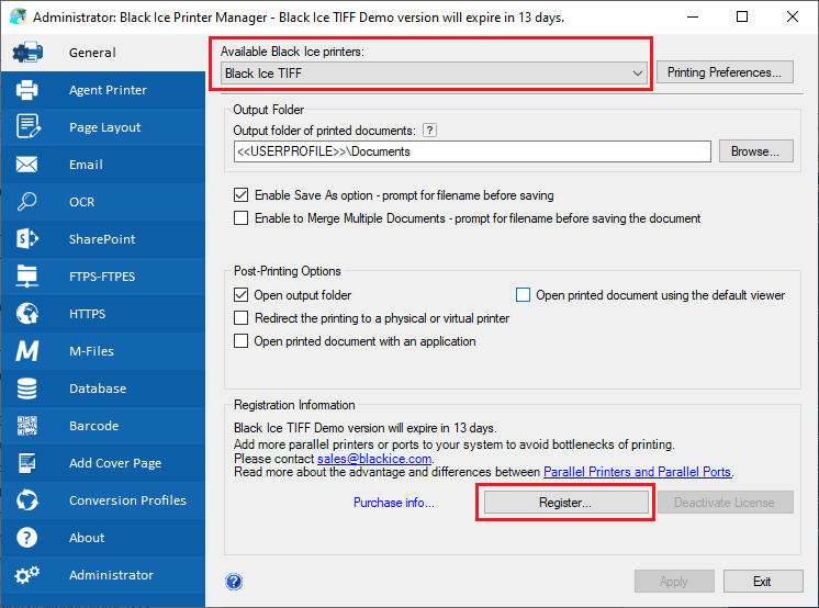 The Printer Driver automatically registers as Demo during installation. If the user receives a registration error during installation, refer to section Manually registering the Monochrome Demo.