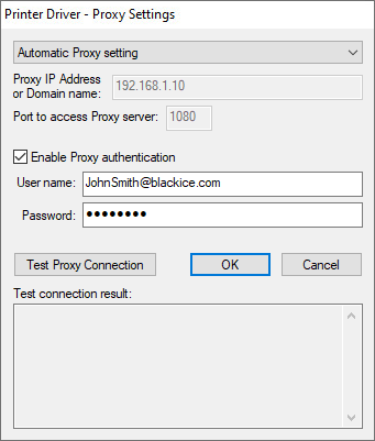After entering the IP Address/Domain Name, Port, and possible Authentication Credentials to access the Proxy Server desired to use, click the Test Proxy Connection button to test the connection through the Proxy Server towards the Black Ice License Server.